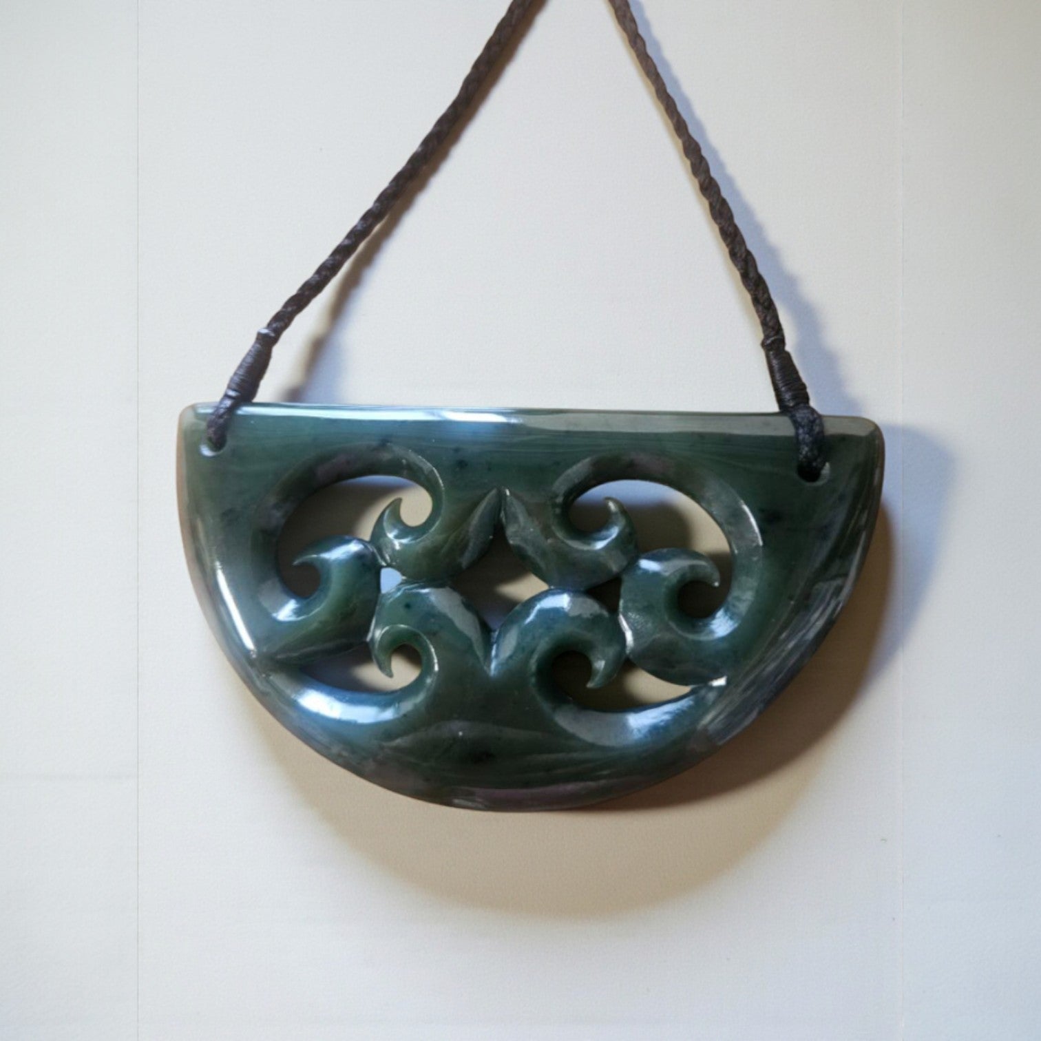 Polished Half circle Pounamu Breastplate with multiple koru's in centre